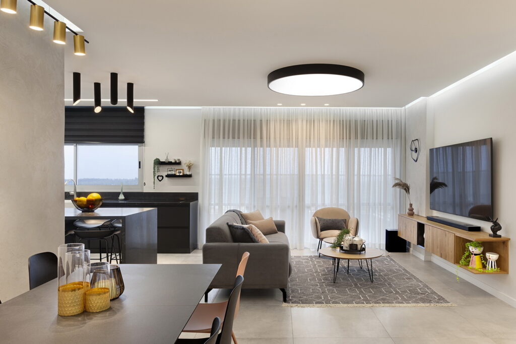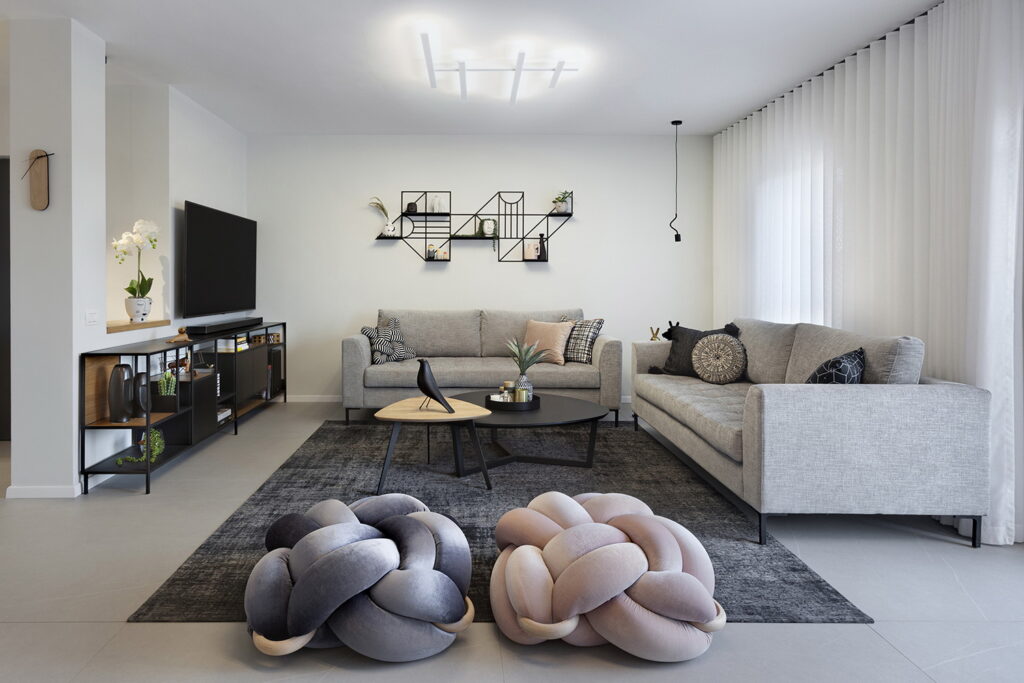 עיצוב של דירת 4 חדרים במודיעין, בסגנון מודרני, צעיר ומוקפד. הדירה עוצבה בגוונים מונוכרומטיים עם נגיעות חמימות ורכות שהוסיפו מאוד לתחושה הביתית והנעימה בחלל.
